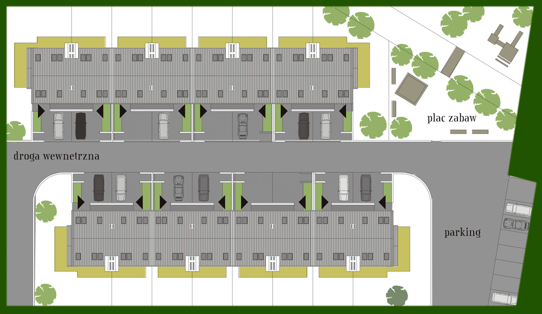 W obrębie działki budynki usytuowane będą tarasowo, z dojazdem od strony ul. Kamiennej w wyżej położonej części działki, i ogólnodostępnymi terenami parkingów zieleni urządzonej i placu zabaw dla dzieci w niżej położonej części działki, w pobliżu rowu melioracyjnego.